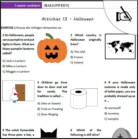 Ein five-minute worksheet mit Wortschatzrätseln rund um Halloween.