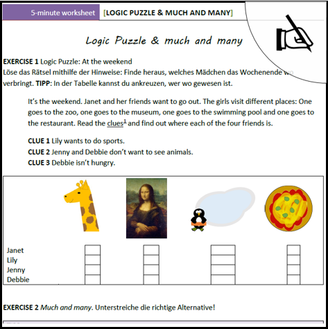 Ein five-minute worksheet mit einem Logic Puzzle und einer Übung zu much / many.