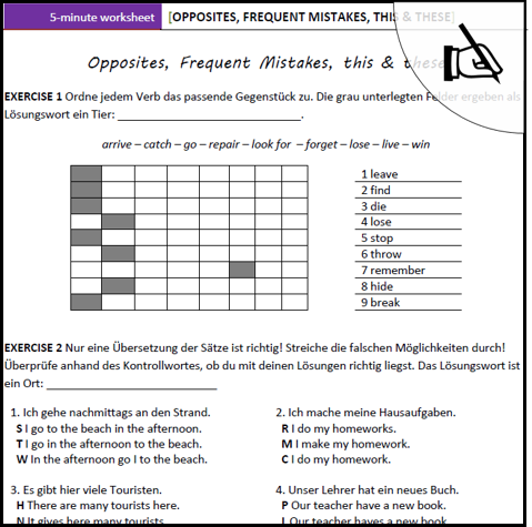 Ein five-minute worksheet mit Wortschatzübungen zum Thema Gegenteile und Grammatikübungen zu häufigen Fehlern und this vs these.