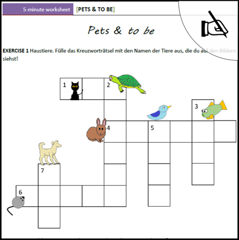 Ein five-minute worksheet mit zwei einfachen Rätsel zu den Themen Haustiere und Formen von to be (am, is, are).